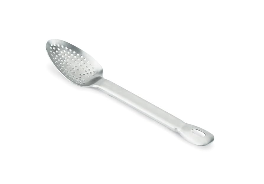 Description: Basting Spoon, one-piece heavy duty, perforated, 16 gauge stainless steel, patented handle with turn down design, satin finish, 13-1/4" (33.6CM) length, limited warranty, NSF certified, imported, Jacob's Pride® Collection, Limited Lifetime Warranty (Refer to vollrathfoodservice.com for full warranty policy)