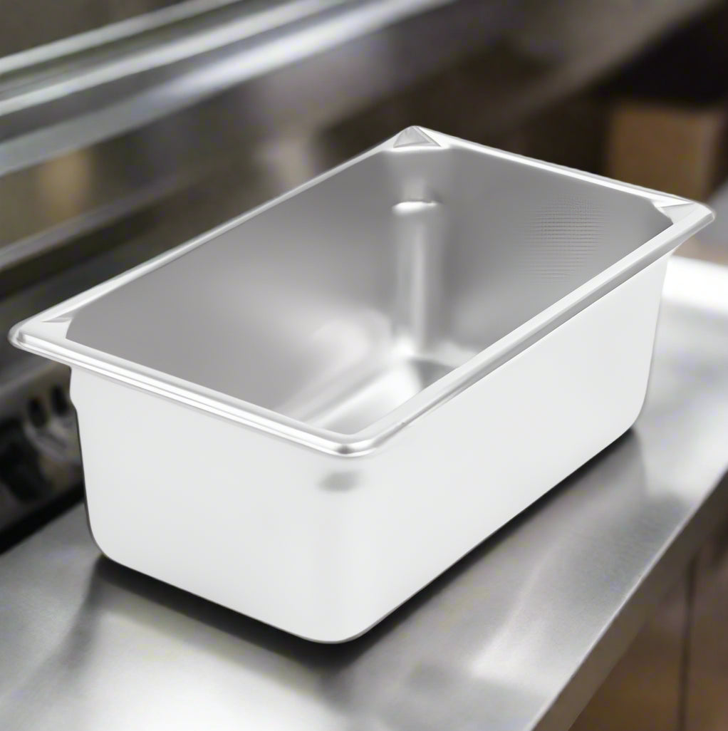 Description: Super Pan V® Food Pan, 1/4 size, 4" deep, 3 qt capacity, 22 gauge, 300 series stainless steel, reinforced pour corners, reverse formed flattened edges, anti-jamming design, NSF, Made in USA, Jacob's Pride® Collection
