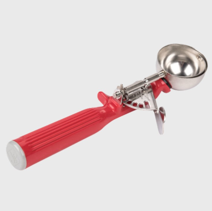 Description: Disher, round bowl, size 24 (1-1/3 oz. capacity), 1-7/8" bowl dia., 18-8 stainless with one-piece color coded red plastic handle with all-natural antimicrobial NSF, Made in USA, Jacob's Pride® Collection, Limited Lifetime Warranty (Refer to vollrathfoodservice.com for full warranty policy)