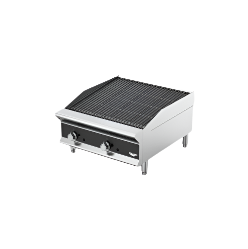 Description: Medium-Duty Charbroiler, gas, countertop, 12"W x 29-1/4"D x 15-1/4"H, radiant or lava rock setup (lava kit sold separately), manual metal control knobs, (1) burner, reversible grill plate, 3"H backsplash & tapered side splashes, includes (1) drip tray, stainless construction, adjustable flame setting, 4" legs, 40,000 BTU, cETLus, ETLsanitation (ships natural gas includes LP conversion kit) (Refer to vollrathfoodservice.com for full warranty policy)