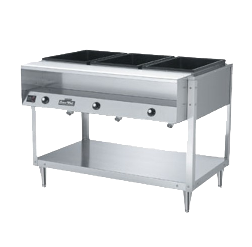 Description: ServeWell® Hot Food Table, (2) wells, 32"W x 32"D x 34"H, Thermoset fiber-reinforced resin wells with brass drain valves, individual capillary tube thermostatic controls for each well, cast-in dome heating elements, low-water indicator light, mechanical guards on all controls, open base with stainless steel undershelf, includes 7-1/2" wide plate shelf & 8" wide x 3/8" thick poly cutting board, stainless steel construction, adjustable legs, 10' cord with NEMA 5-15P, 960 watts, 8.0 amps, 120v/60/1-ph, KD, cULus, NSF, Made in USA (Refer to vollrathfoodservice.com for full warranty policy)