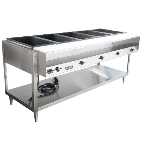 Description: ServeWell® Hot Food Table, (5) wells, 76"W x 32"D x 34"H, Thermoset fiber-reinforced resin wells with brass drain valves, individual capillary tube thermostatic controls for each well, cast-in dome heating elements, low-water indicator light, mechanical guards on all controls, open base with stainless steel undershelf, includes 7-1/2" wide plate shelf & 8" wide x 3/8" thick poly cutting board, stainless steel construction, adjustable legs, 10' cord with NEMA 6-30P, 3000-4000 watts, 16.6 amps, 208-240v/60/1-ph, KD, cULus, NSF, Made in USA, made to order, cannot be cancelled or returned (Refer to vollrathfoodservice.com for full warranty policy)