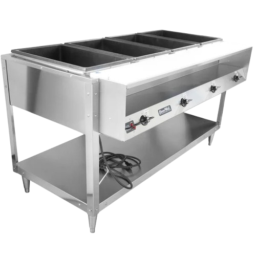 Description: ServeWell® Hot Food Table, (4) wells, 60-11/16"W x 32"D x 34"H, Thermoset fiber-reinforced resin wells with brass drain valves, individual capillary tube thermostatic controls for each well, cast-in dome heating elements, low-water indicator light, mechanical guards on all controls, open base with stainless steel undershelf, includes 7-1/2" wide plate shelf & 8" wide x 3/8" thick poly cutting board, stainless steel construction, adjustable legs, 10' cord with NEMA 6-20P, 2400-3200 watts, 13.3 amps, 208-240v/60/1-ph, KD, cULus, NSF, Made in USA, made to order, cannot be cancelled or returned (Refer to vollrathfoodservice.com for full warranty policy)