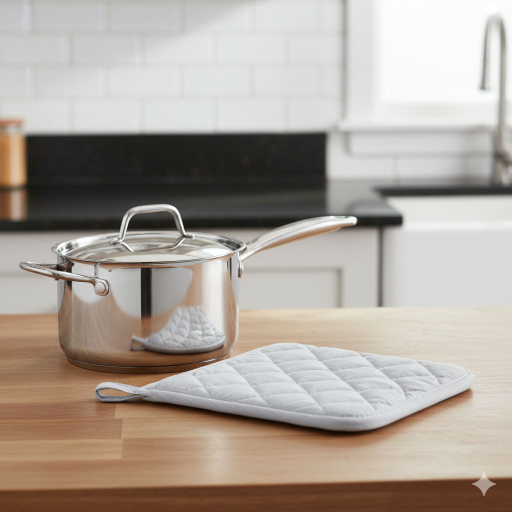 Description: Pot Holder, 8" x 8", silicone coated, 100% cotton, silver
