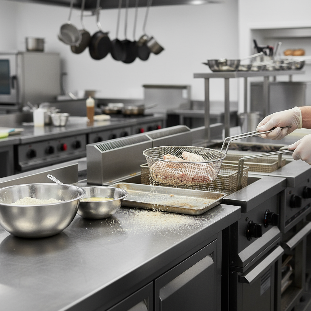 Description: Breading Basket, 10" dia. x 3"H, medium mesh, non-stick white plastic coating, steel wire