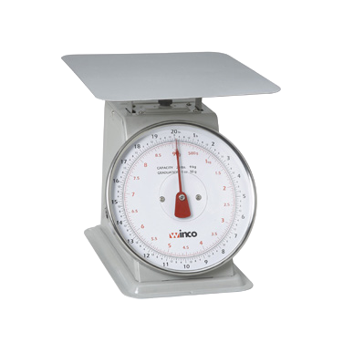 Description: Receiving/Portion Scale, 8" dial, 20 lb./9.09 kg. x 1 oz./50 g., calibrated, 9-3/5" steel platform, easy-to-read dial, painted steel