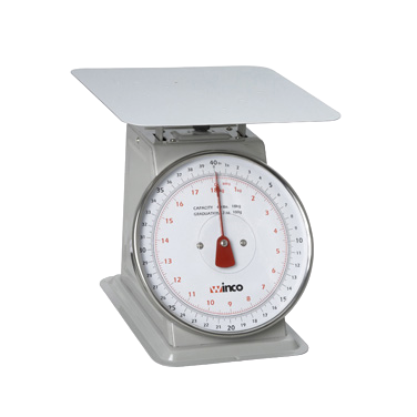 Description: Receiving/Portion Scale, 8" dial, 40 lb./18.18 kg. x 2 oz./100 g., calibrated, 9-3/5" steel platform, easy-to-read dial, painted steel