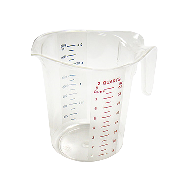 Description: Measuring Cup, 2 qt., raised external markings in quarts (red letters) and liters (blue letters), one-piece, tapered open handle, stackable, secure grip, heat resistant up to 210°F (98°C), dishwasher safe, polycarbonate, NSF