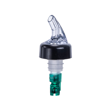 Description: Measuring pourer, 3/4 oz., with black collar, clear spout, inside ball bearing, poly plastic cork, green tail