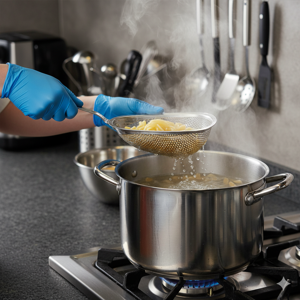 Description: Colander, scoop, 7"L x 4"W bowl, 11" handle, round, 18/8 stainless steel