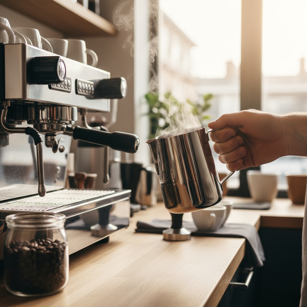 Description: Contemporary Milk Frother, 48 oz., 6-1/2" x 6", tapered spout, wide bottom, large handle, dishwasher safe, 18/8 stainless steel, mirror finish