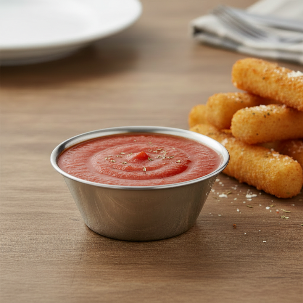 Description: Sauce Cup, 4 oz., 3-1/5" dia., round, rolled edge, stainless steel, satin finish interior, mirror finish exterior